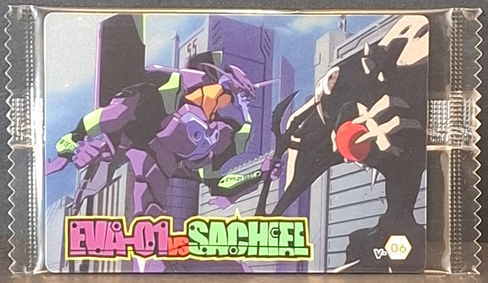 Bring home the epic clash of Unit‑01 and the third Angel with this sealed EVA‑01 vs Sachiel V‑06 wafer card. A dramatic collectible that recreates one of the most iconic battles from Neon Genesis Evangelion.