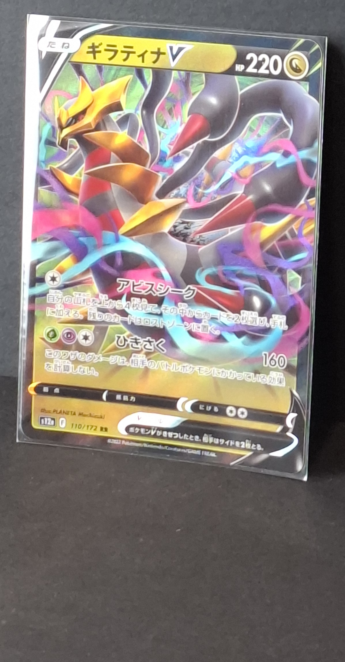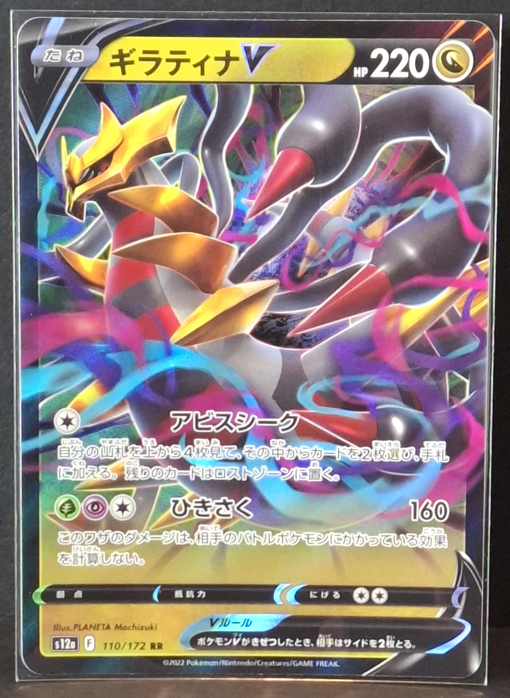 Enter the realm of shadow with Giratina V, a striking Dragon-type holo from VSTAR Universe. This Japanese holofoil card features versatile utility through Abyss Seeking, which fuels hand advantage at the cost of sending cards to the Lost Zone. Complemented by a hard-hitting Shred attack (160 damage) and backed by PLANETA Mochizuki’s visually compelling art, it’s both a collectible centerpiece and a practical battler.