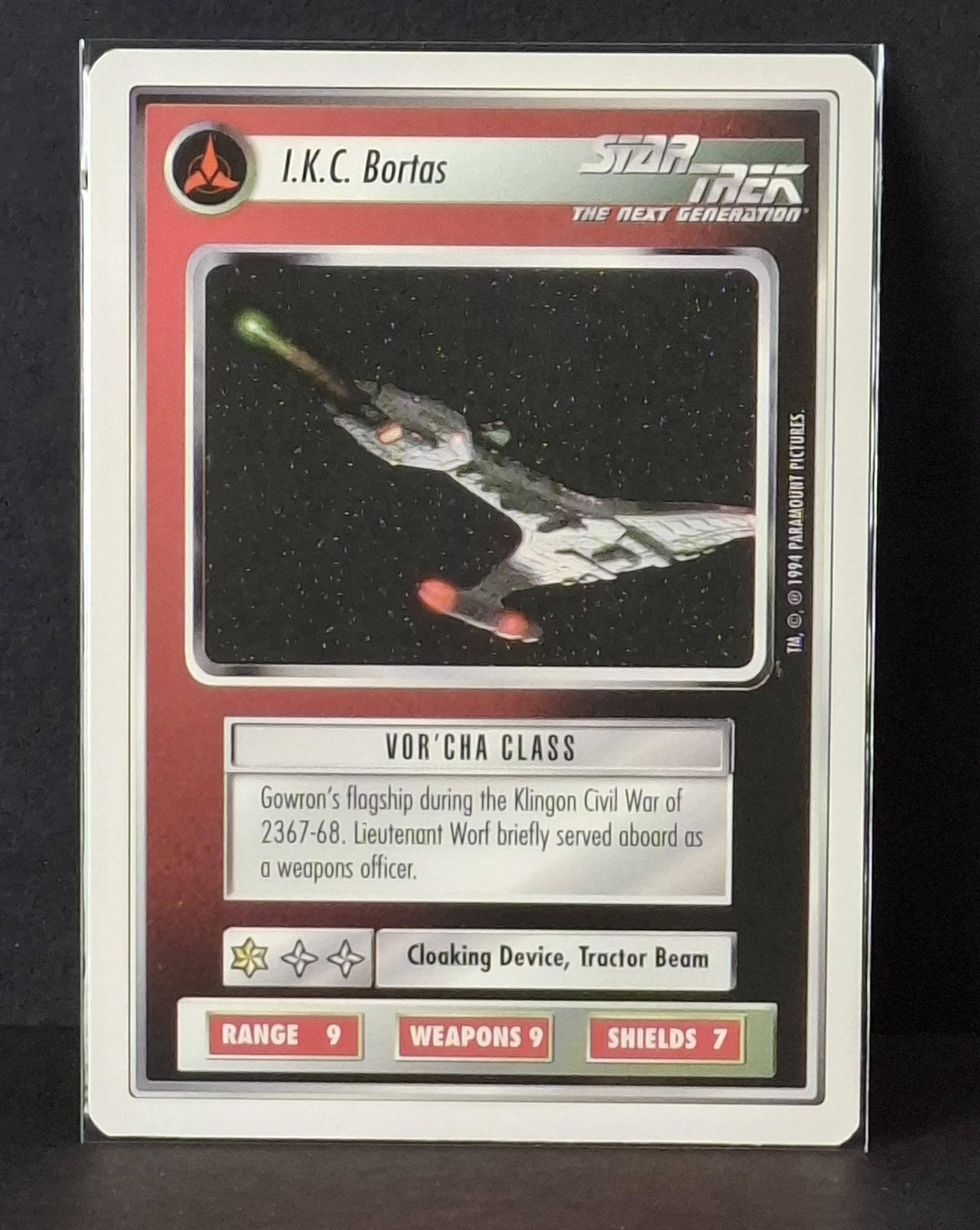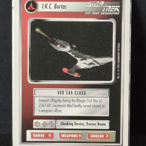 I.K.C. Bortas white border single card from the 1994 Premiere Unlimited series. Gowron’s flagship during the Klingon civil war of 2367-68. Lt. Worf briefly served as a weapons officer.